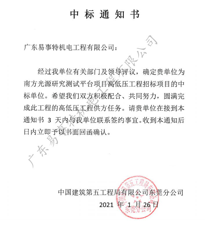 2021年1月26日,我司憑借豐富的施工經(jīng)驗、雄厚的技術(shù)力量和良好的信譽成功中標南方光源研究測試平臺項目高低壓工程。